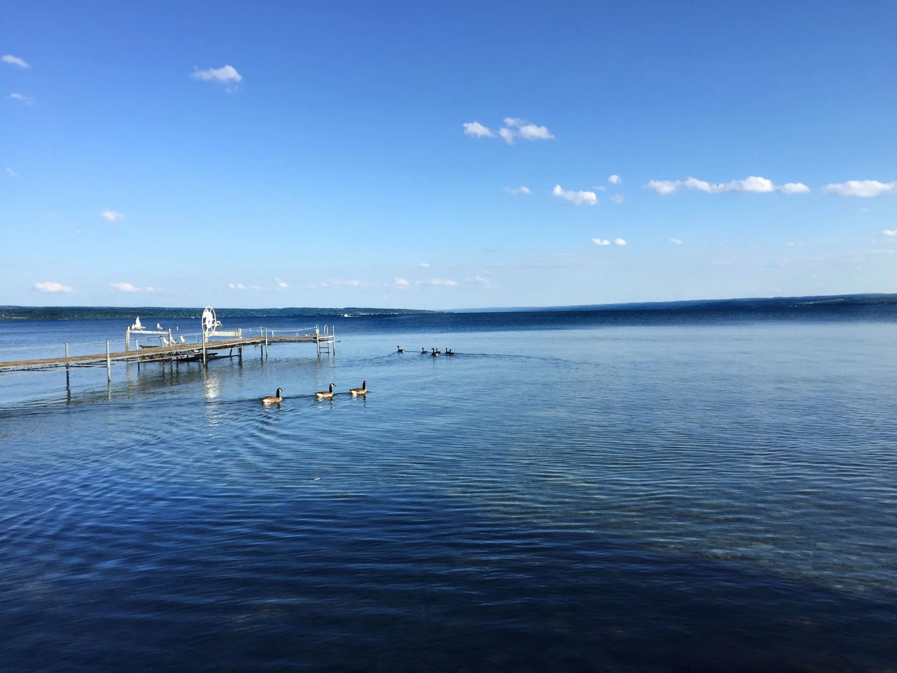 Lakefront: 218’ stone beach including docks, deck, and shed